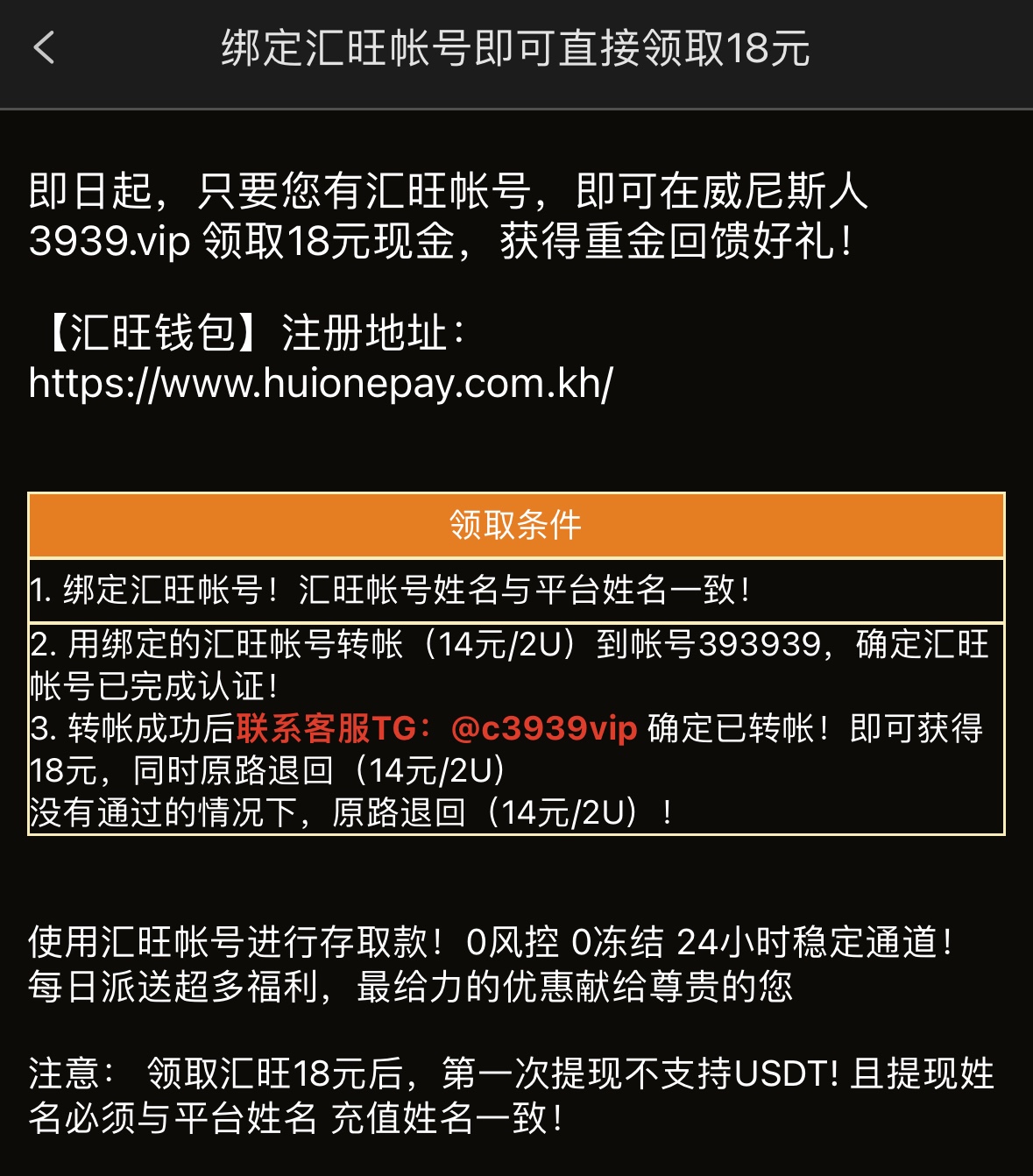 注册绑定半年活跃的USTD地址自助申请彩金每天只有100个名额,绑定汇旺要2u做为认证,认证完成会原路退回送18彩金,这两个活动只能选择一个参加