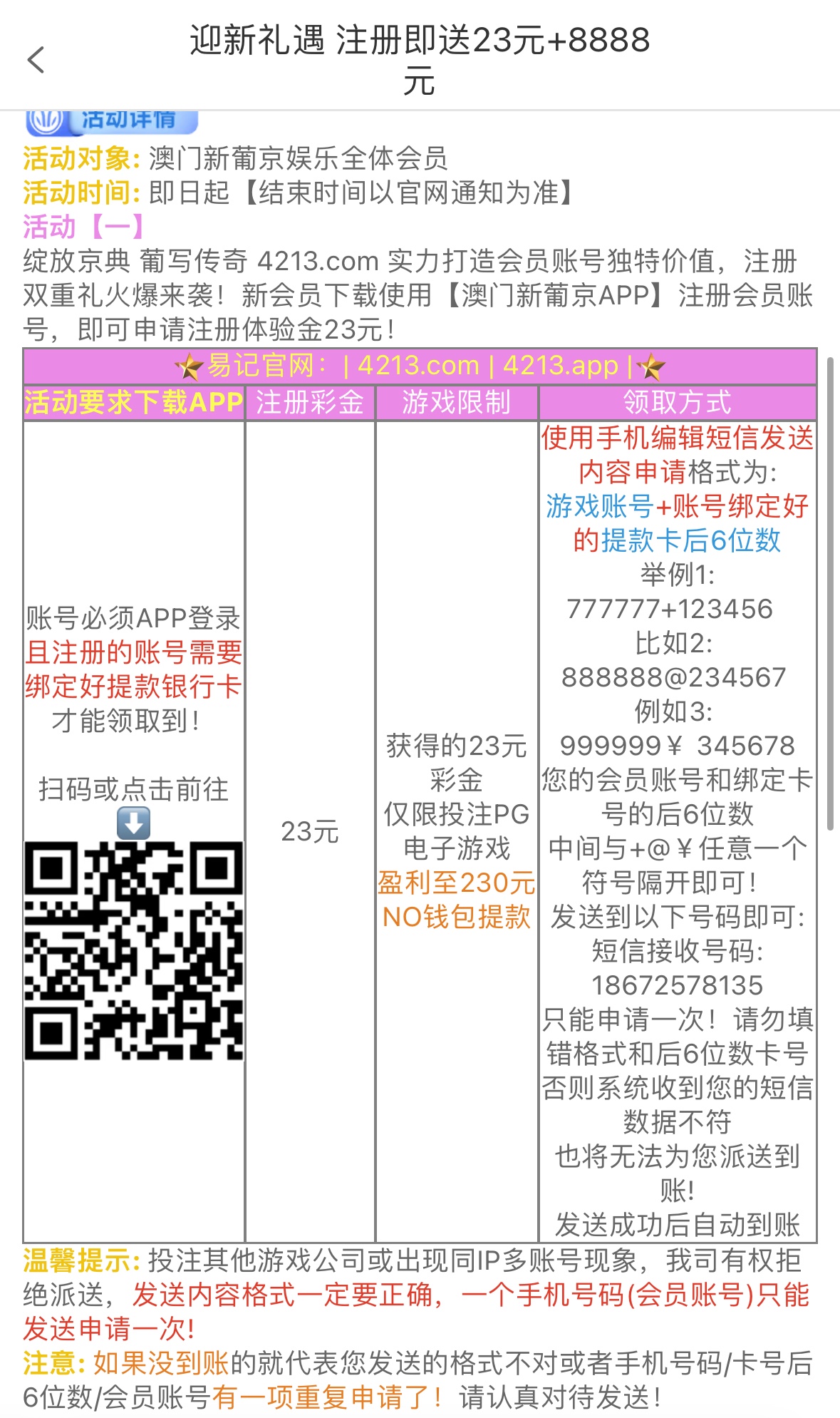 总共是三个平台送23注册彩金,按照优惠里面的格式申请,盈利至230提款,仅限NO钱包,仅限PG电子