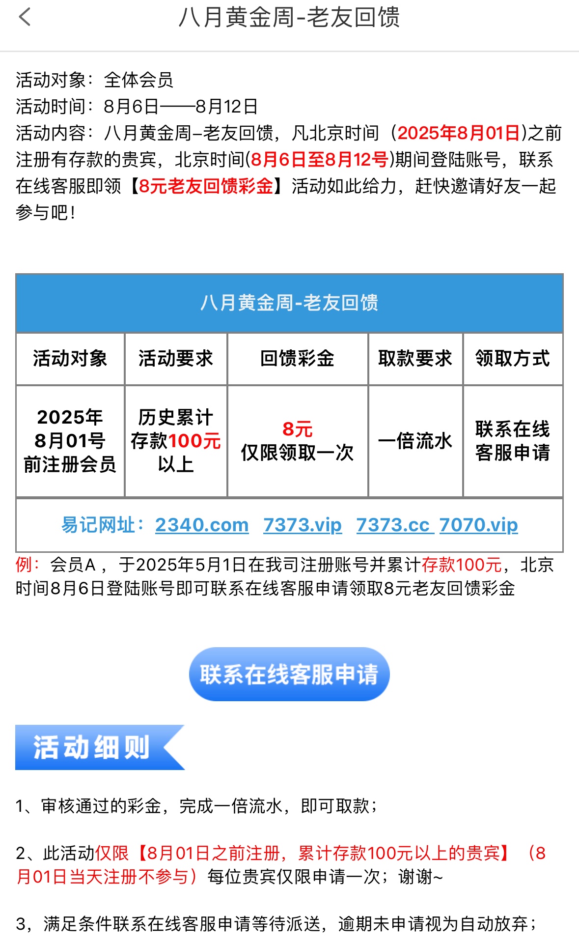 在8月1号之前注册并历史存款过100的兄弟6号-12号联系客服领取8彩金,彩金一倍流水
