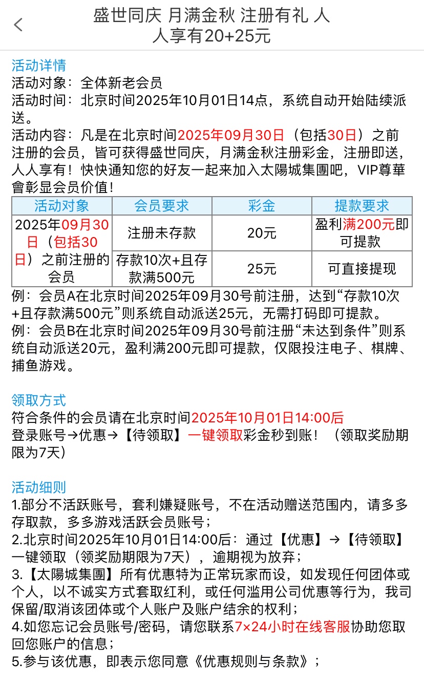 在9月30号之前包括当日注册的在10月1号下午2点在优惠里自助领取彩金,盈利满200取款