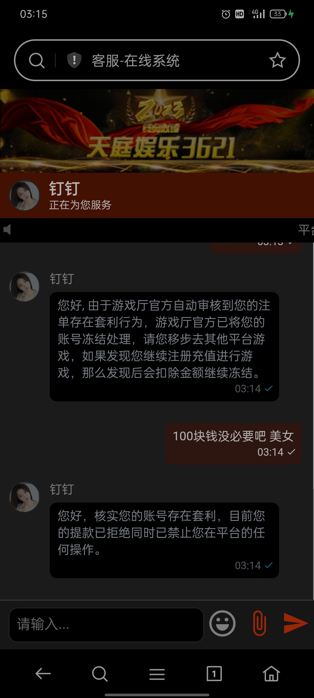 天庭100块钱都要黑 直接封号兄弟们 去骂一下