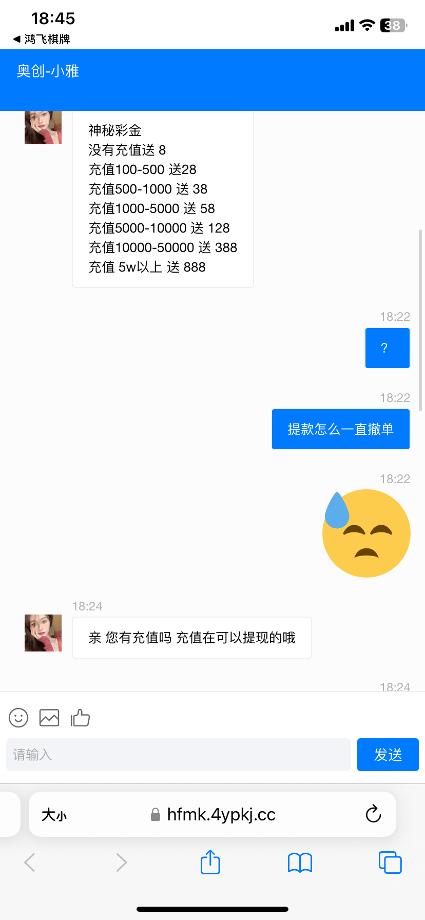 注册绑卡秒3,找客服申请38注册彩金,贪了没了!出款自测!说是不限制游戏,100提!要短信的下图取!