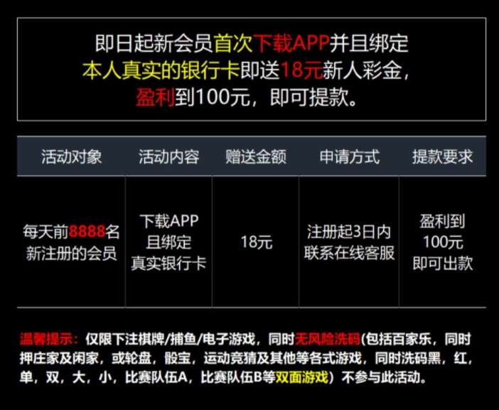 新用户注册完善资料联系在线客服申请18,申请彩金要身份证正反面和银行卡照片。(地址、身份证号可以打码)最低100提