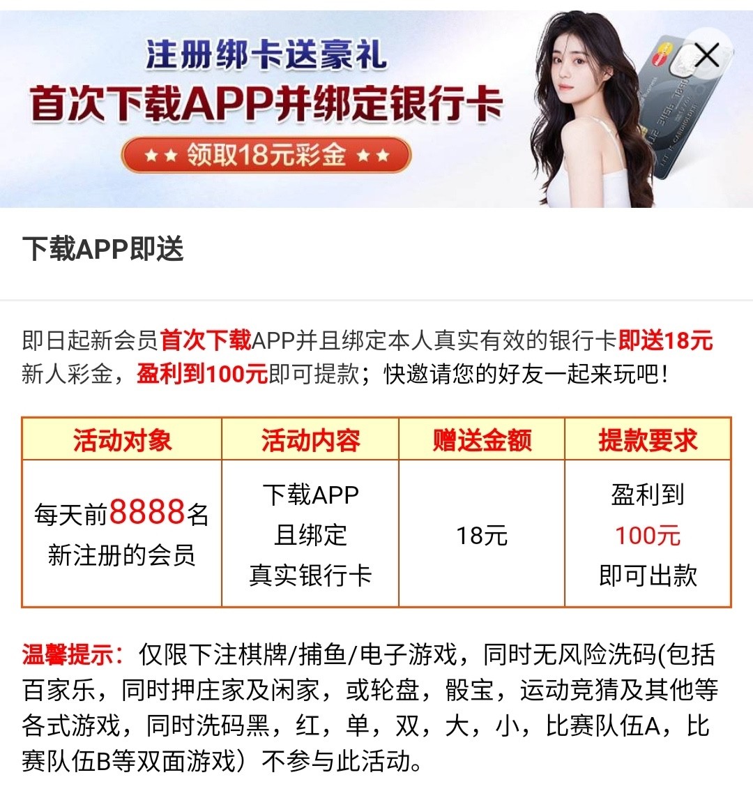 活动:新用户注册绑卡完善个人资料找客服申请18彩金,