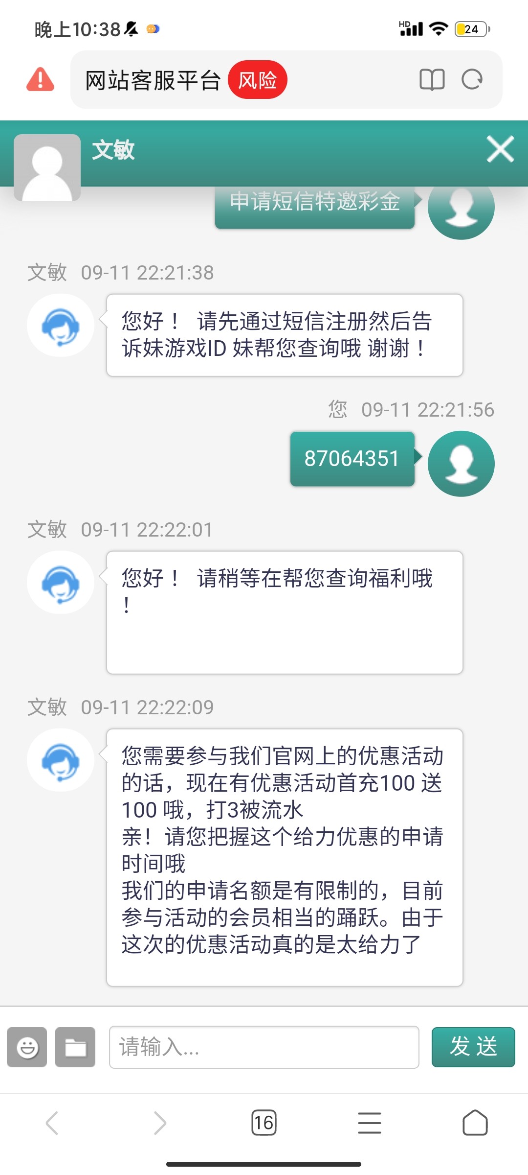 短信来的,一开始说有短信特邀彩金,后面又说没有,后面说充值100送100,充值了又说名额满了  纯纯黑台 大家避雷!!! 大家避