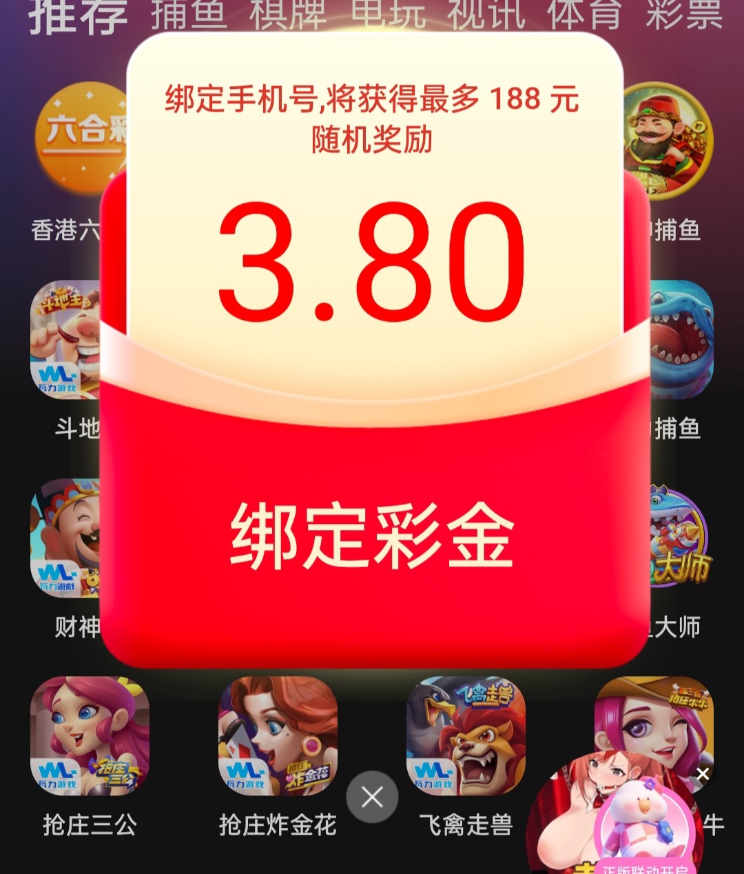 注册秒彩金2.88 绑定手机号 点击奖励秒3.8