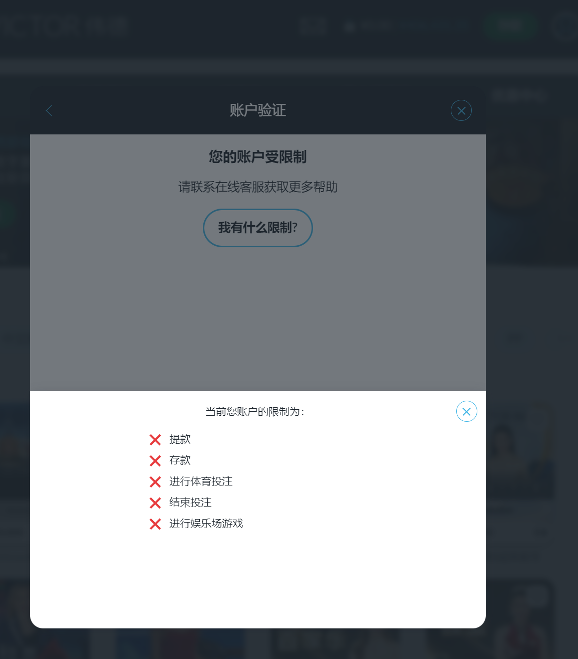 这几天陆续存了三四万了,都输了,昨天存了5000,真人打到42个,但是提款最高单笔只能10000,提了10笔一万,到账了2笔,其他的一直没反应,今早看到提款退回,而且限制了不能存款,不能提款,不能游戏,要提供户口本,手持身份证,存款流水,手机号等资料验证,早上提交了全部资料,都验证完了,结果其他限制都解除了,唯独不能提款,说需要审核1-2个工作日,等审核结果,妈的,心里不踏实啊。