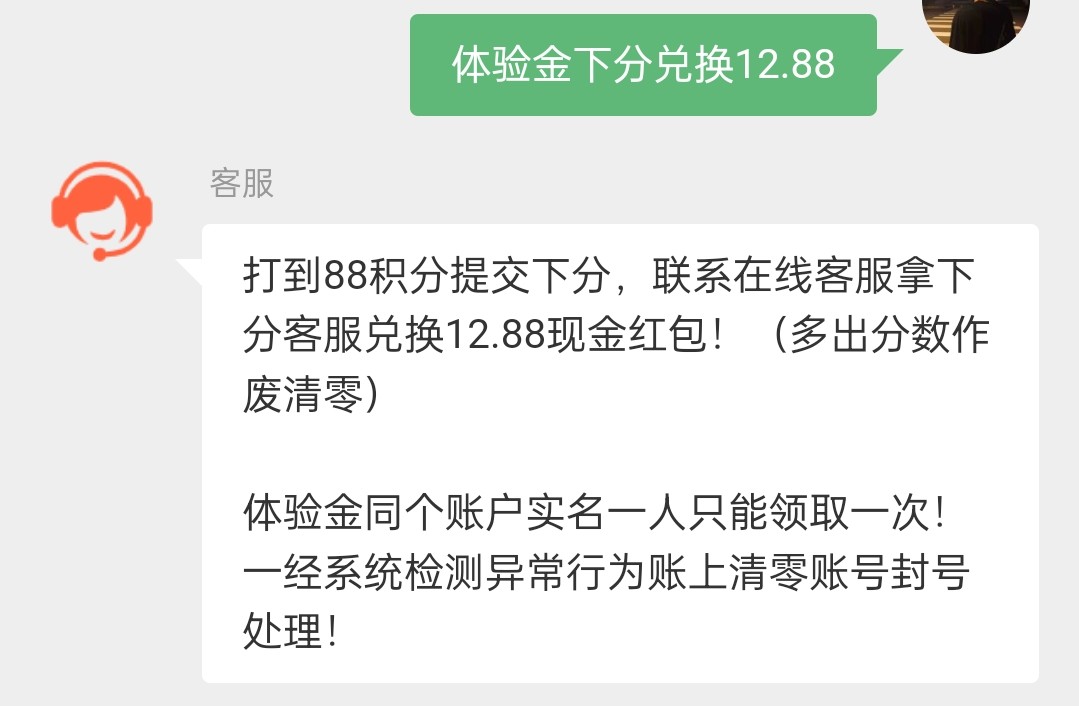 体验金充值18,体验金打到88以上记得及时兑换!打到88积分提交下分,联系在线客服拿下分客服兑换12.88现金红包!(多出分数作废清零)