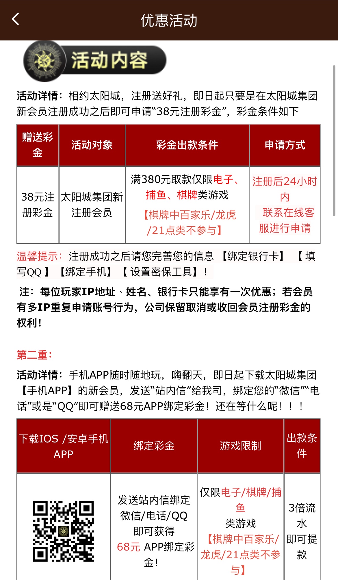 撸过的兄弟无视,没撸过的可以去试试,注册完善资料绑定银行卡手机号密保QQ号,联系客服领38彩金满380提现