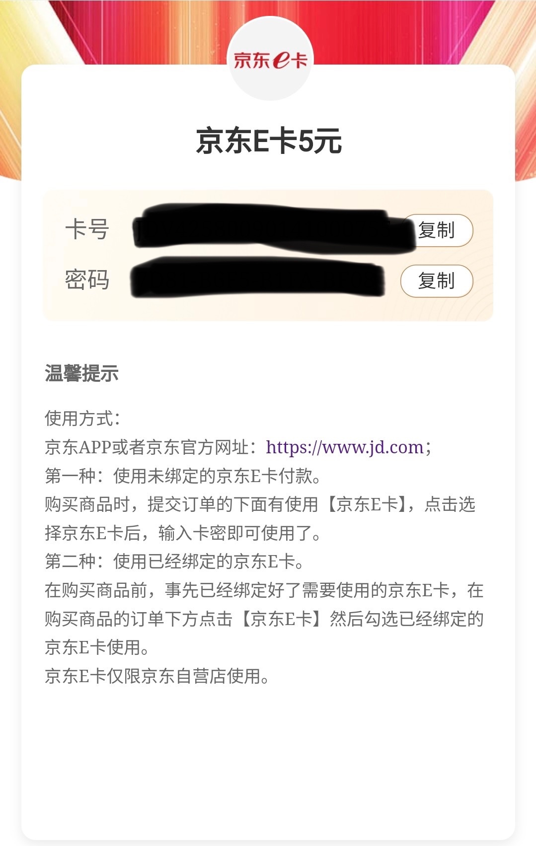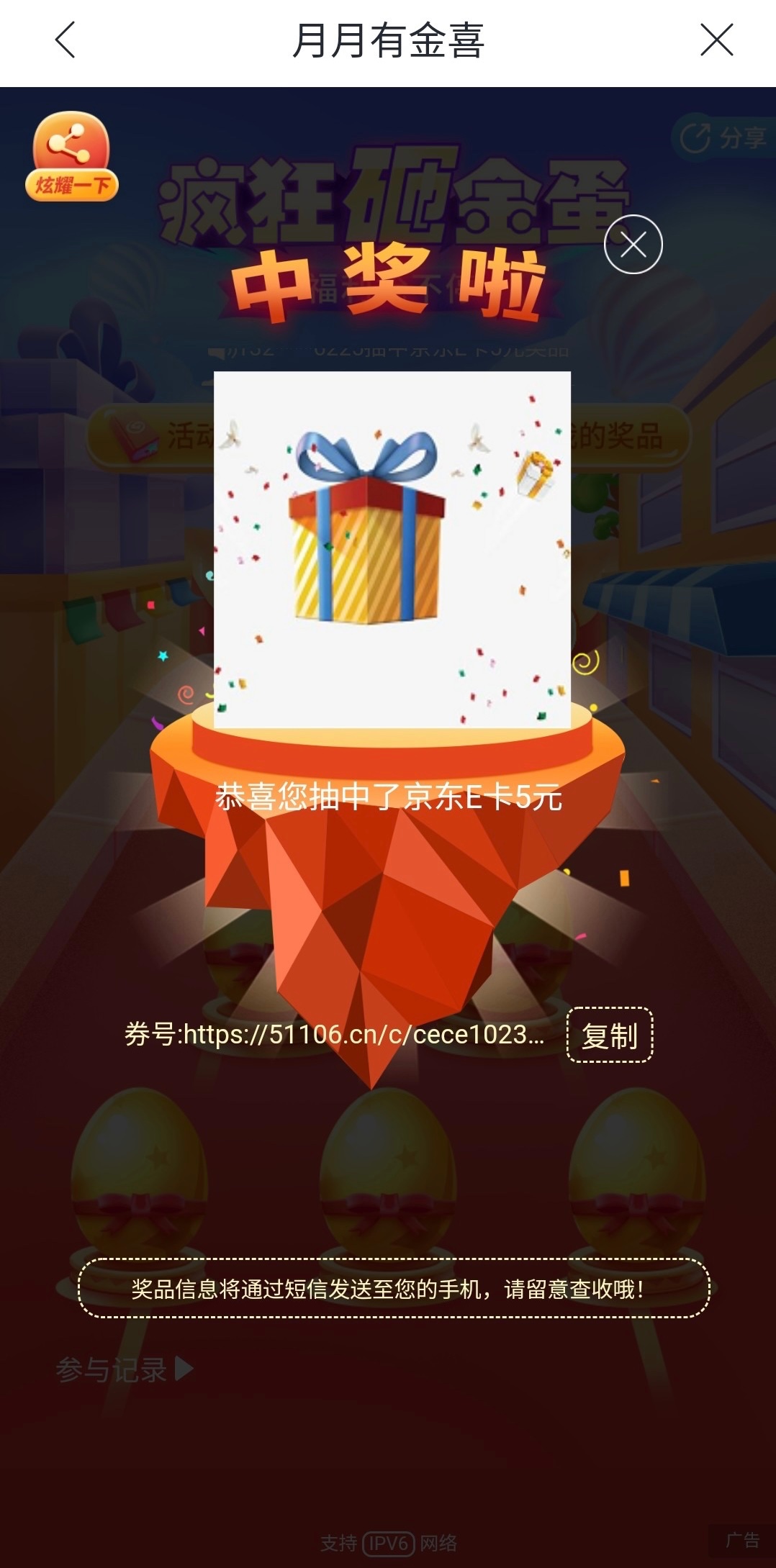 每个月只能中奖一次,不中第二天再去。e卡打开链接就显示卡号卡密了