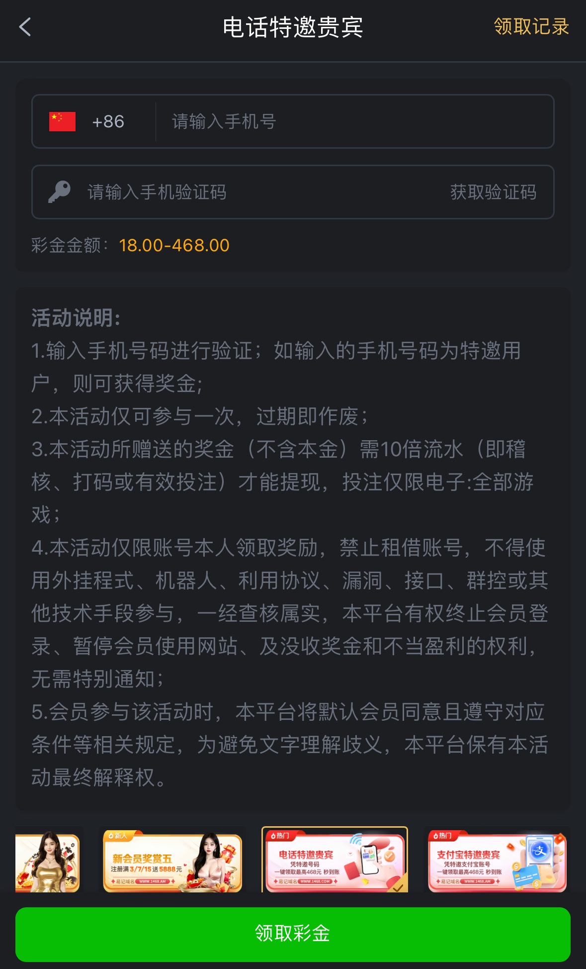 碰瓷电话/支付宝特邀,彩金10倍流水,限电子